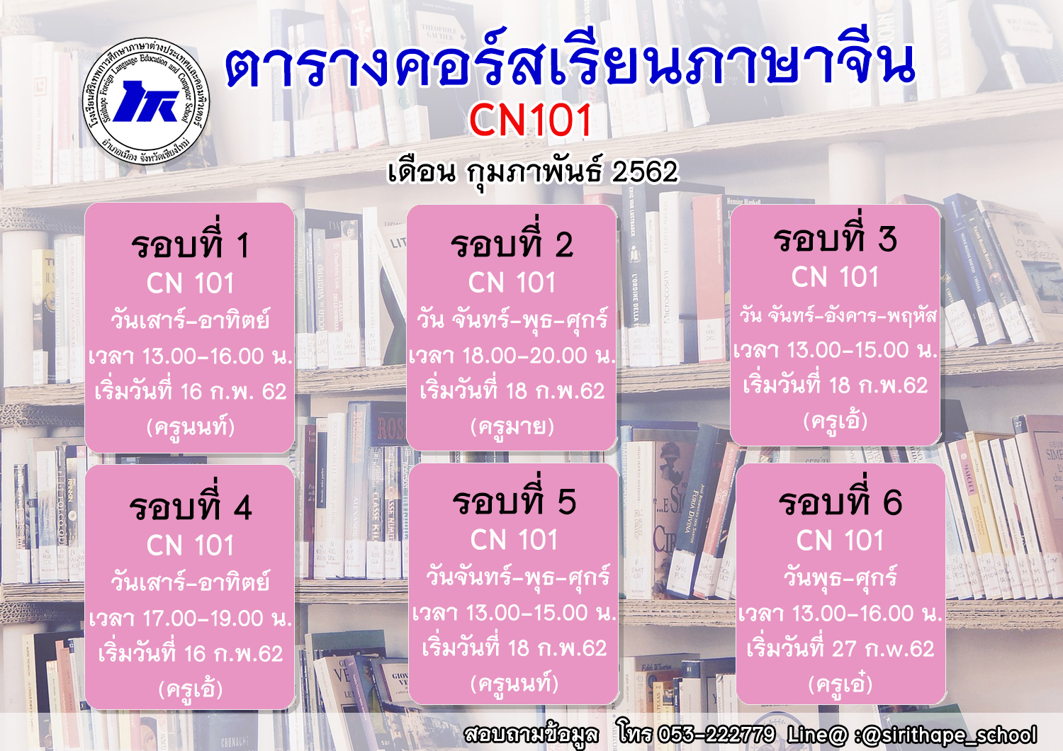 Update! : ตารางเรียนภาษาจีน เดือน กุมภาพันธ์ 2562 ผู้สนใจเรียน หรือต้องการสอบถามข้อมูลเพิ่มเติมสามารถติดต่อได้ที่เบอร์โทร 053-222779